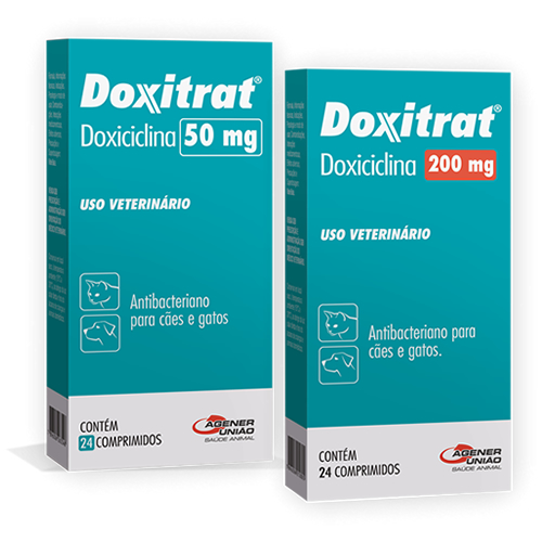 Doxitrat® 50 mg: cartucho com 24 comprimidos palatáveis e bissulcados.